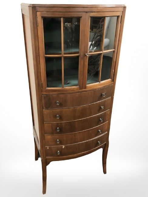 A reproduction mahogany bowfront cabinet, fitted drawers beneath, 52 cm x 40 cm x 128 cm.
