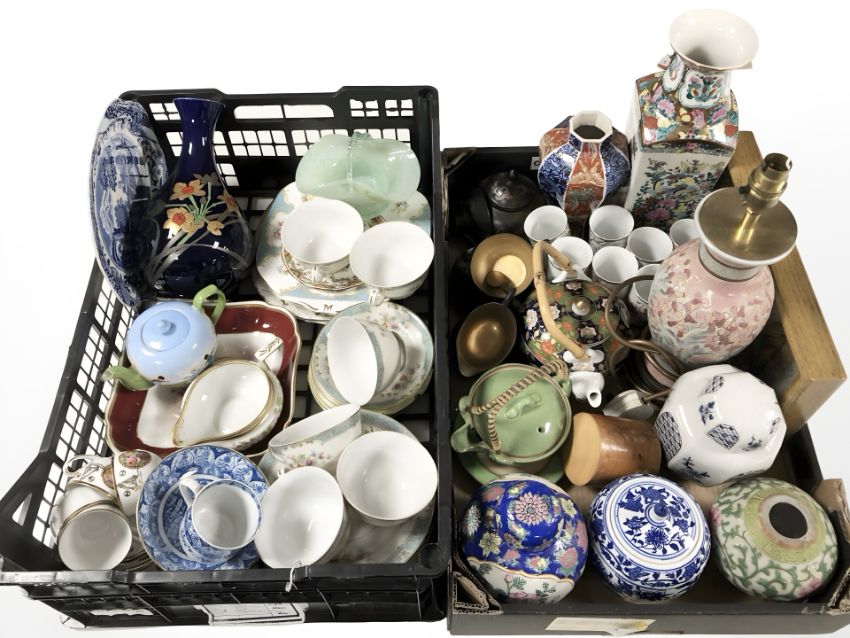 A group of contemporary oriental porcelain ginger jars, teapots, vase, various tea china, lamp base, etc. (2 boxes)