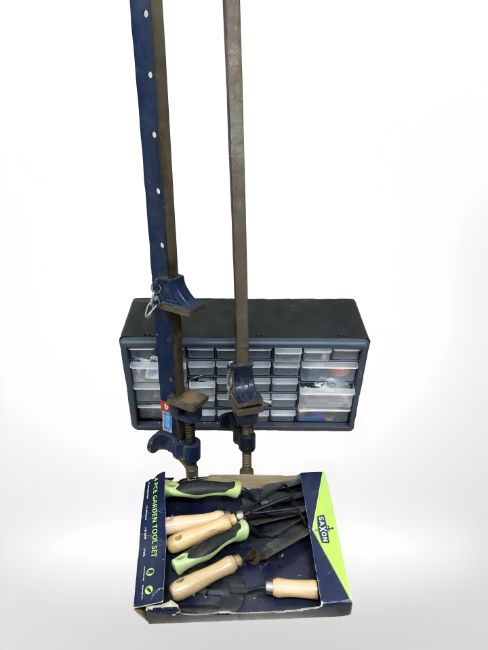 A multi drawer hard ware chest and contents, small group of garden hand tools and two Rolsen vice