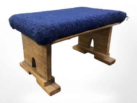 A polished onyx church font on oak pedestal, and a further church stool.