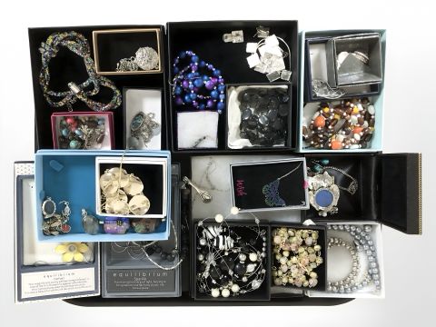 A tray of mixed modern costume jewellery, bead necklaces, pendants, some silver items, etc.