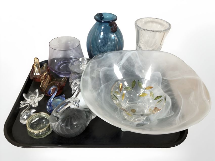 A group of glass swan paperweights, a Caithness vase, further studio glass twin handled vase and other pieces of crystal.