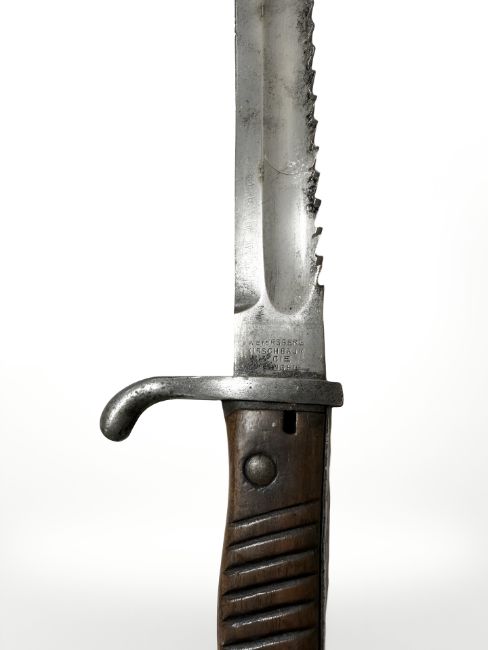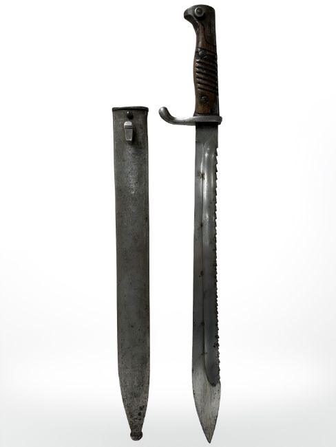 A German WWI S98/05 sawback sword bayonet, 36cm blade, late pattern 1916 inspection stamp, manufactured by Wyersberg Kirschbaum & Cie, Solingen, in steel scabbard