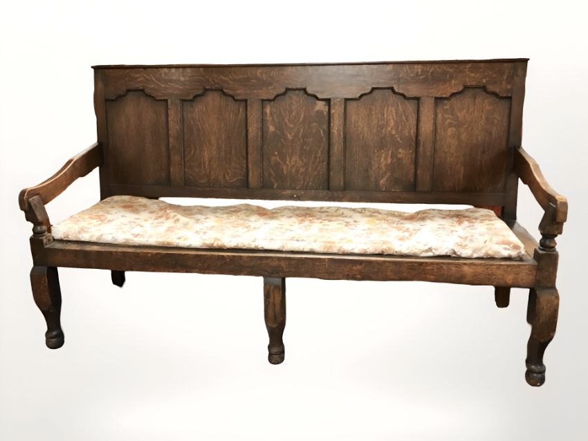 A George III panelled oak settle, 185 cm x 67 cm x 105 cm