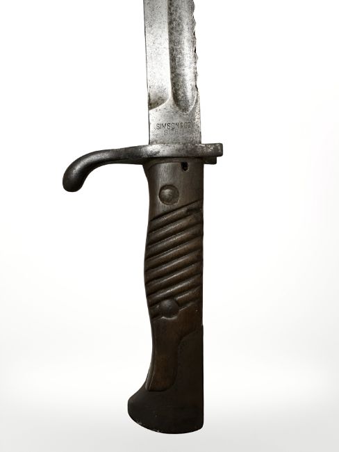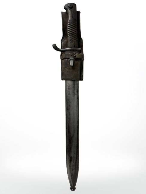 A German WWI S98/05 sawback sword bayonet, 36cm blade, early pattern 1915 inspection stamp, manufactured by Simson & Co, Suhl, in steel scabbard with leather frog