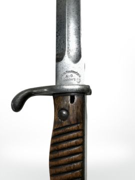 A German WWI S98/05 sword bayonet with sawback officially removed, 37cm blade, wooden grips and flashguard, late pattern 1916 inspection stamp, manufactured by Deutsche Maschinenfabrik A-G Duisburg,