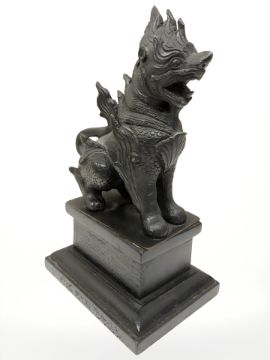A contemporary oriental bronze statue on wooden plinth of a temple dog, height 17 cm.