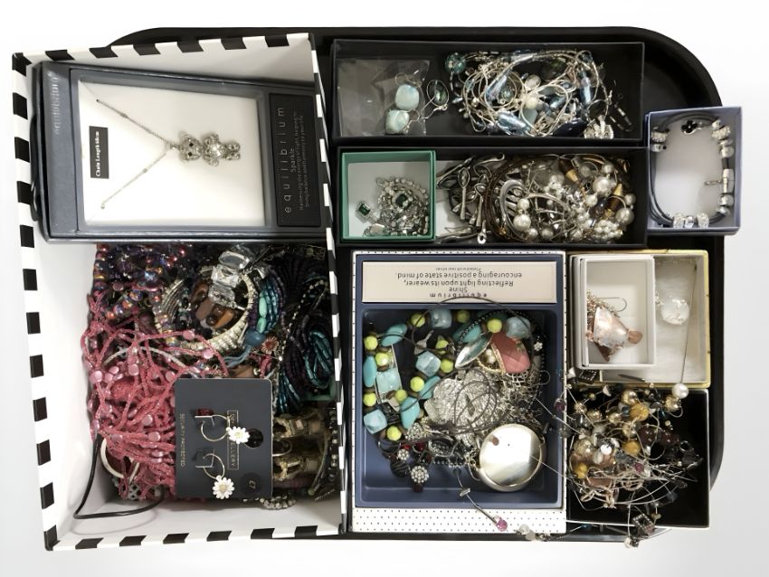 A tray of mixed modern costume jewellery, charm bracelet, bead necklaces, pendants, earrings, etc.