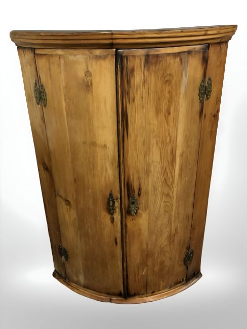 A George III pine bow front hanging corner cabinet, height 103 cm.