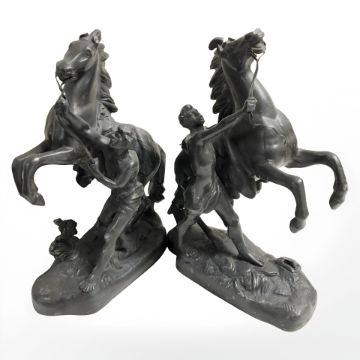 A pair of patinated spelter figures of rearing horses, height 30 cm.
