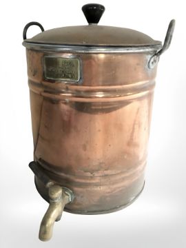 A White Brothers of 236 Westgate Road, Newcastle on Tyne twin-handled copper keg, with brass tap, height 37 cm, and a further 19th century copper bucket with cast iron handle.