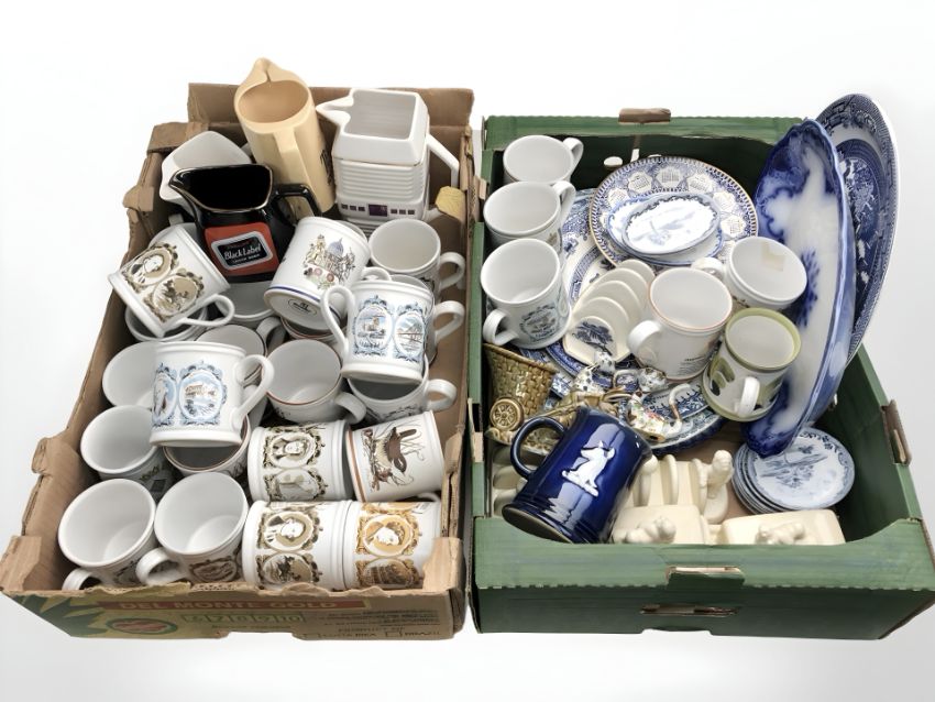 A large quantity of Denby mugs, blue and white plates, Lurpak butter dishes and toast rack, whisky jugs, etc. (2 boxes)