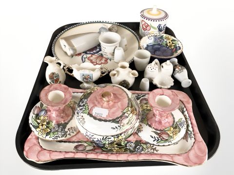 A Maling pink lustre tray, lidded box and pair of squat candlesticks, a group of crested china, Poole dish and preserve pot, Lladro figure of a girl