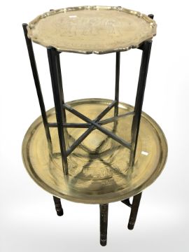An Eastern bobbin turned brass topped table with Islamic script, diameter 59 cm, together with a further oriental table on metal stand.