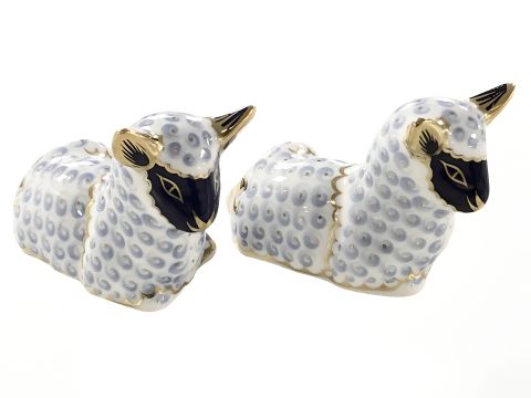 Two Royal Crown Derby lamb paperweights with gold stoppers.
