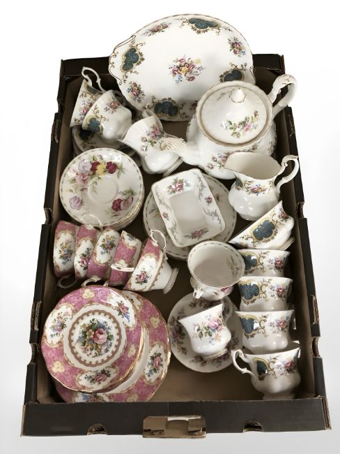 A Royal Albert Lady Carlyle part tea set, further Royal Albert tea china including Berkeley, Sweet Pea, Tranquility, etc. (1 box)