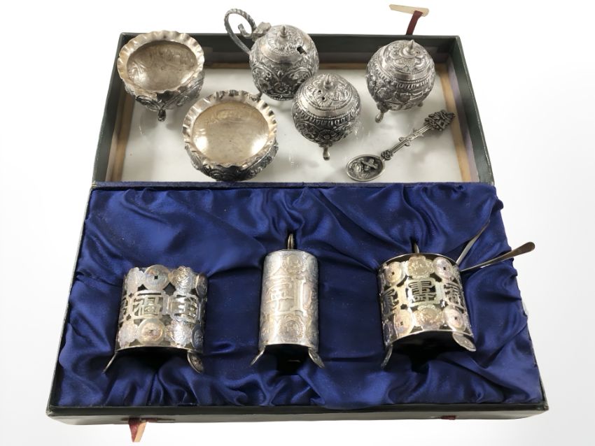 A Chinese silver cruet set, stamped 85, together with a further Eastern white metal cruet set, a pair of salts and a spoon.