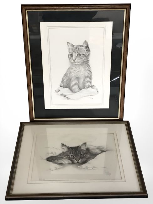 After Sue Willis : Portrait of a cat, limited edition print, signed in pencil and numbered 88 of 750, 26 cm x 35 cm, and a further print of a seated cat after C. Varley.