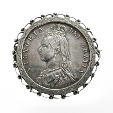 A silver brooch with Victoria 1887 half crown.