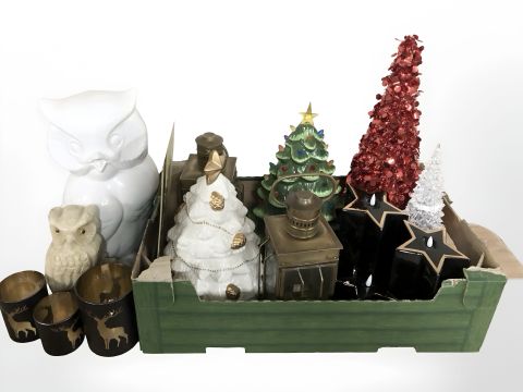 A group of Christmas decorations, lanterns, owl figures, etc. (1 box)