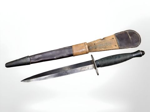 A Fairbairn-Sykes Third Pattern commando fighting knife, with ribbed grip and 16.5 cm double-edged blackened steel blade, War Department proof stamp to pommel, in stitched leather sheath with metal end piece.