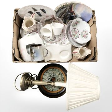 Various ceramics including two Masons fruit basket lustre jugs, collectors plates, oriental bowl, a brass table lamp. (1 box)