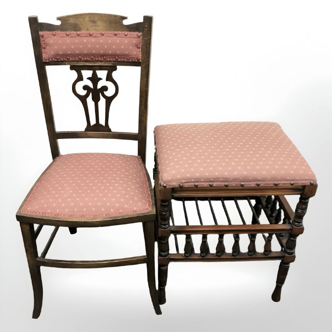 An oak occasional chair and a stool with under shelf in matching fabric.