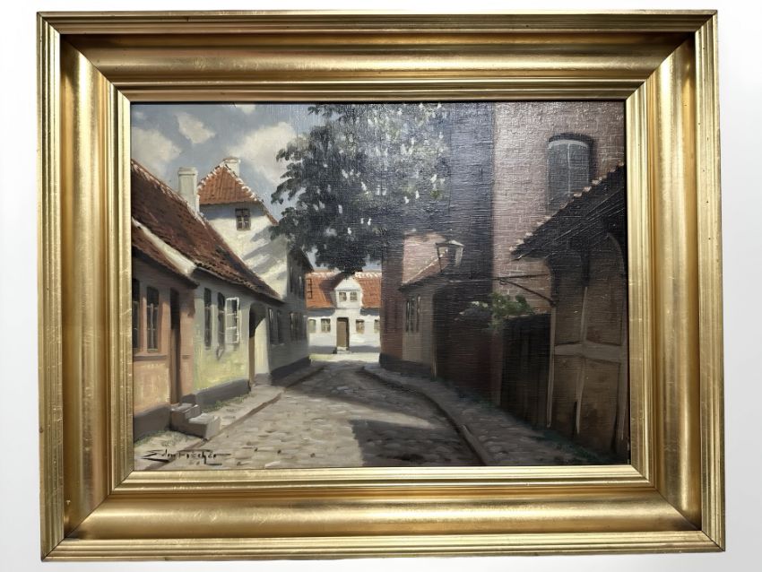 E Fischer : A cobbled street, oil on canvas, 38 cm x 28 cm.