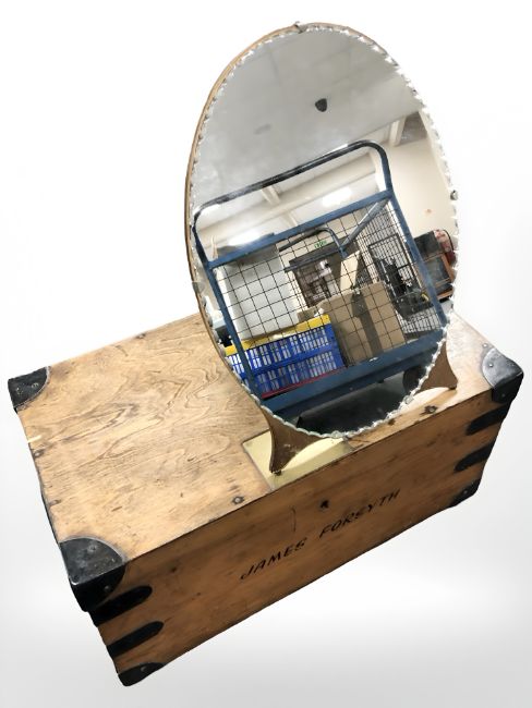 A Victorian pine metal bound trunk, marked 'James Forsythe', width 55 cm, together with a frameless easel mirror.