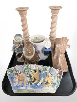 A pair of pottery candlesticks, further Egyptian style figure of a cow, Snow White figures, a Thomasin Smith 'Monkeys in the Jungle' pottery bowl, etc.