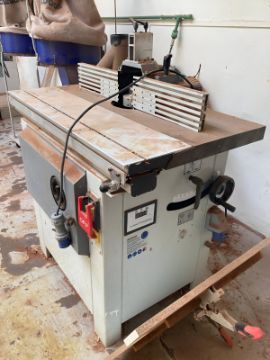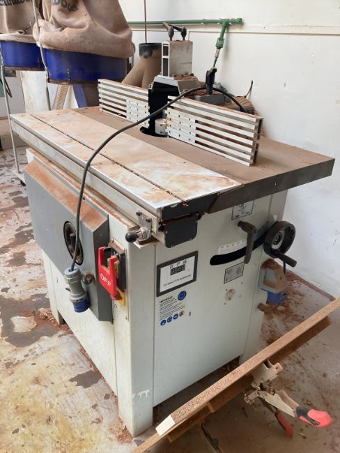 An Axminster four speed spindle moulder, model WS1000TA, 230v, together with a wall shelf containing accessories (See image), approximately height 120 cm, width 100 cm, depth 60 cm