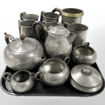 Assorted pewter tankards and tea wares, some with hammered decoration.