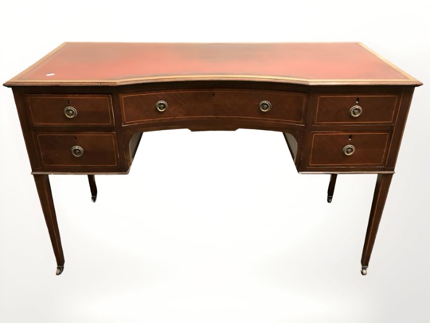 A late Victorian mahogany and satinwood strung inverted bow front writing desk, 130 cm x 55 cm x 81 cm.
