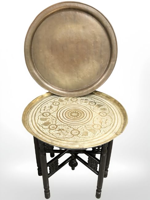 An Eastern bobbin turned brass toped table and further copper shallow dish