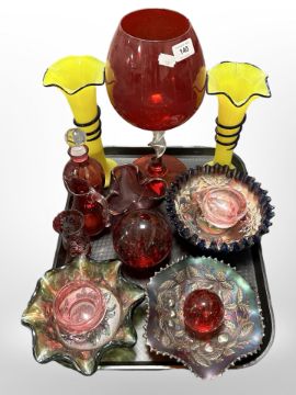 A group of cranberry glass items, three carnival glass dishes, oversized goblet, pair of flared rim vases, etc.