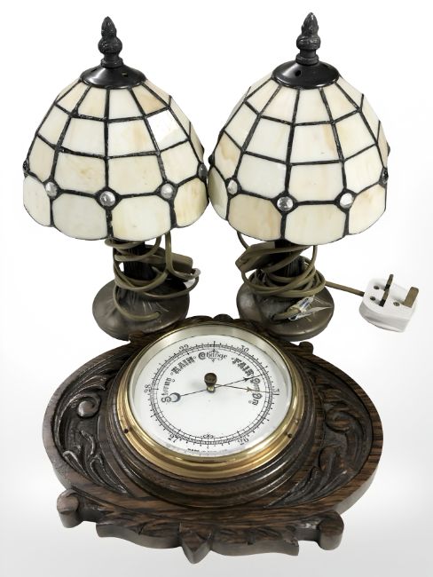A carved oak barometer and a small pair of Tiffany-style table lamps.