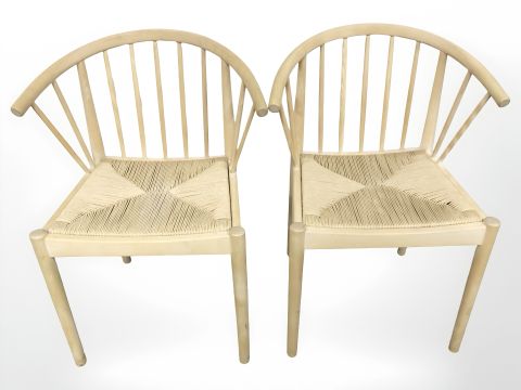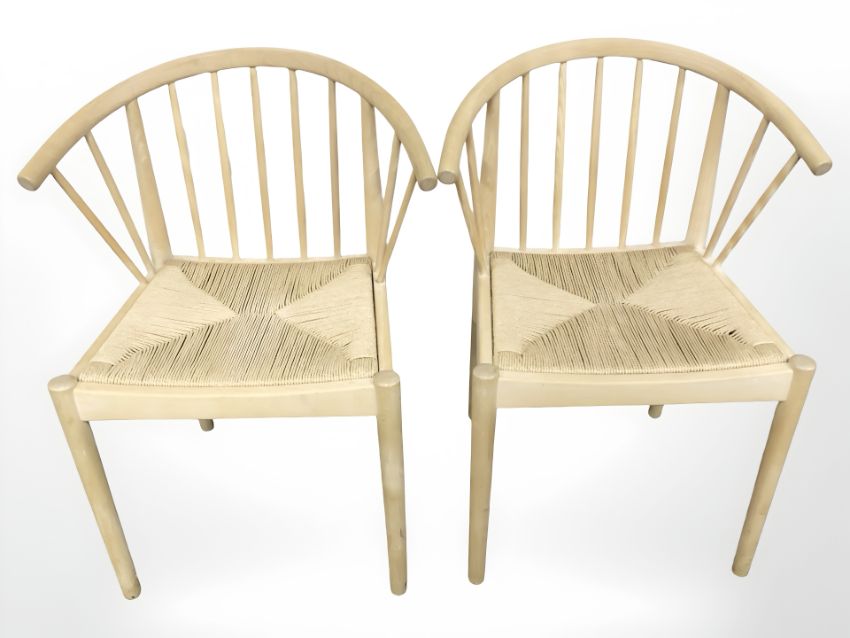 A pair of Scandinavian spindle back elbow chairs with rush seats.