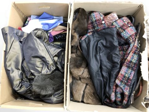 A quantity of fur coats, silk scarves, various vintage clothing, lady's hand bags etc (2 boxes)