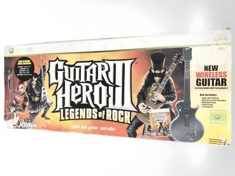 An Xbox 360 console, with controllers, various games and Guitar Hero game.