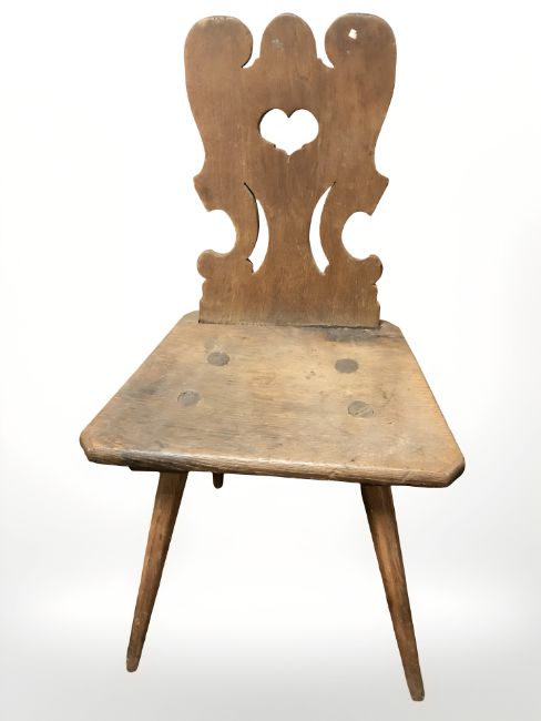 A 19th century rustic oak chair with carved heart back rest, width 50 cm