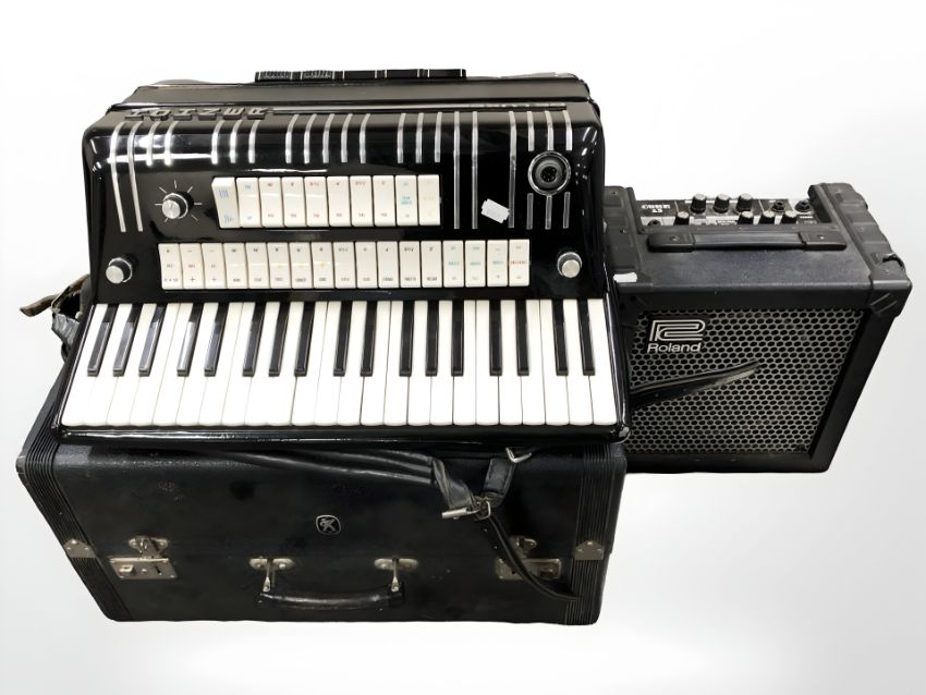 A Hohner Electravox Deluxe piano accordion, in carry case with instructions, and a Roland Cube 15 amplifier.
