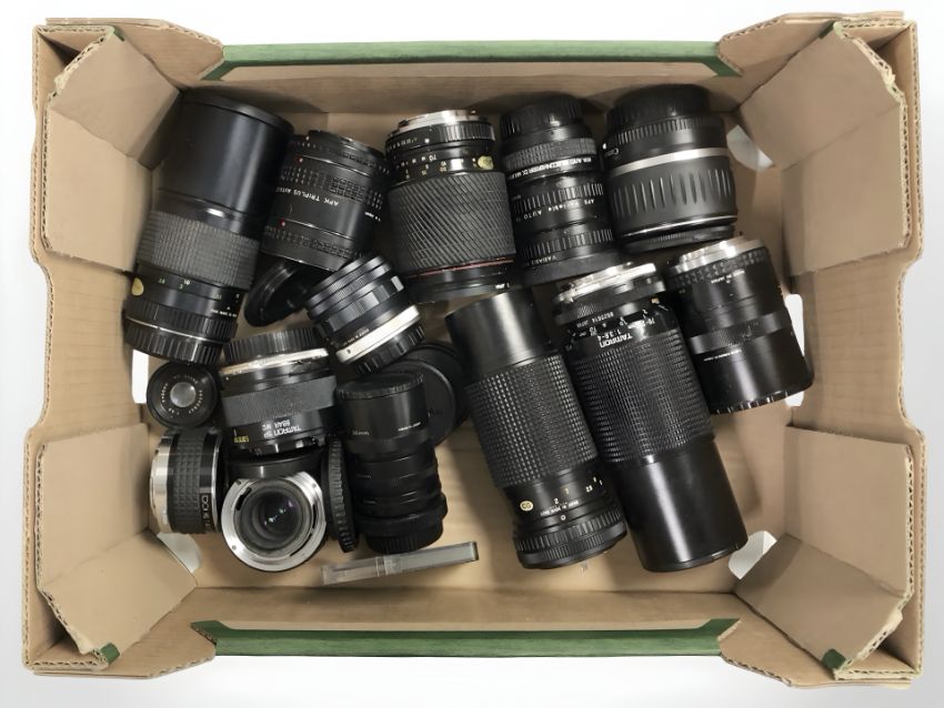 Assorted camera lenses including Tamron, Bell & Howell, Elicar, etc. (1 box)