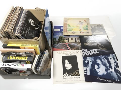 Assorted LP records including Status Quo, The Police, Elton John, The Carpenters, Neil Diamond, 10cc, Wings, Meatloaf, Sting, Bob Dylan, Alice Cooper, John Lennon, The Beatles and a group of music related books and DVDs. (1 box)
