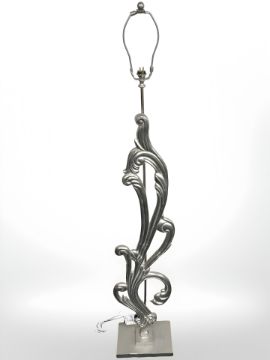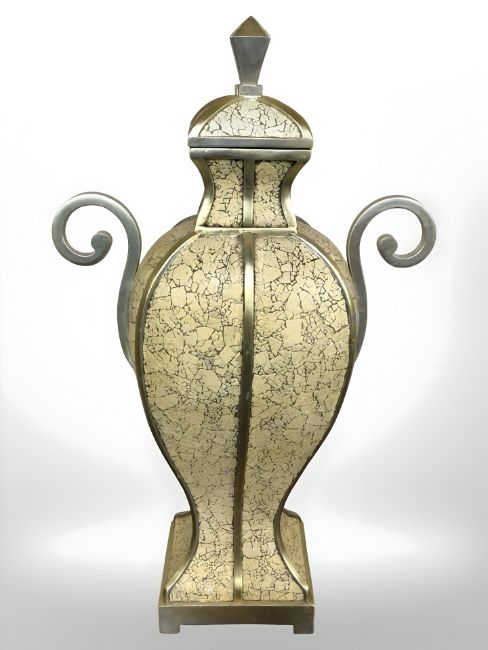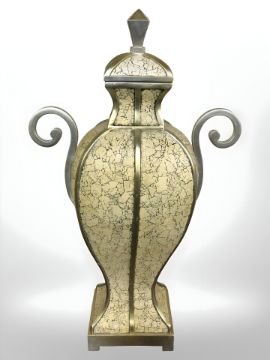 A contemporary decorative silvered standard lamp and a twin handled urn, height 69 cm