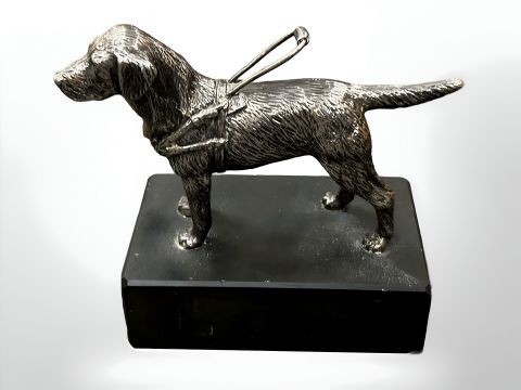A heavy cast metal model of a labrador guide dog, standing on slate plinth, height 13.5 cm.