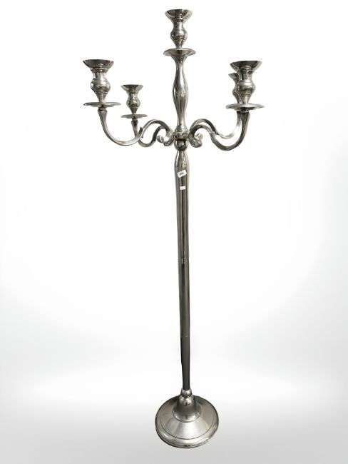 A galvanised polished floor standing candelabrum, height 186 cm.