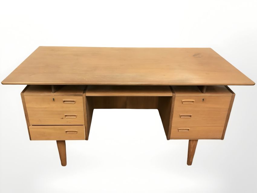 A 20th century Danish teak twin pedestal writing desk, fitted with six drawers, 150 cm wide x 75 cm deep x 73 cm high