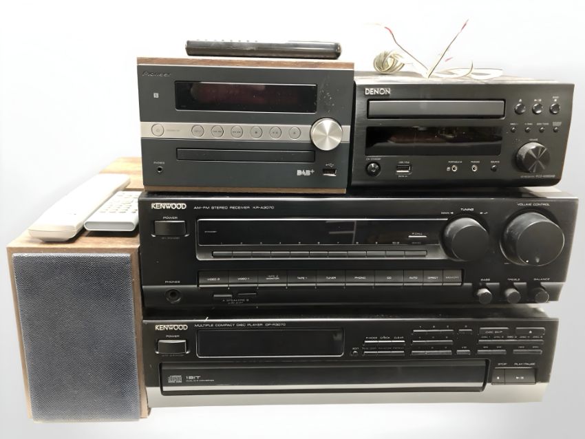 A Kenwood CD player DP-R3070, stereo receiver KR-A3070, a Denon Hi-Fi, Pioneer Hi-Fi and a pair of speakers.