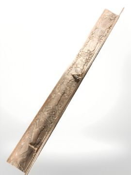 A carved oak wall shelf depicting hunting dogs perusing deer, length 200 cm