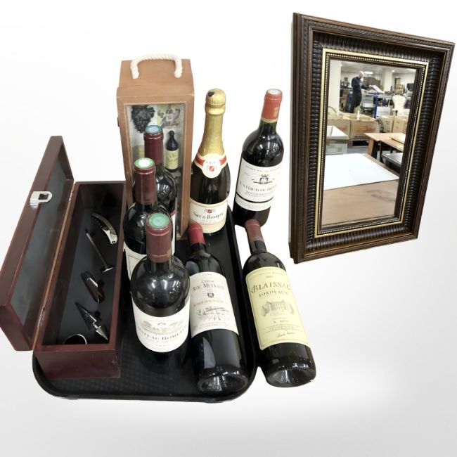 Several bottles of wine, including Chateaux Roc Meynard and Chateaux Romefort, two in wooden presentation boxes, together with a small reproduction mirror.